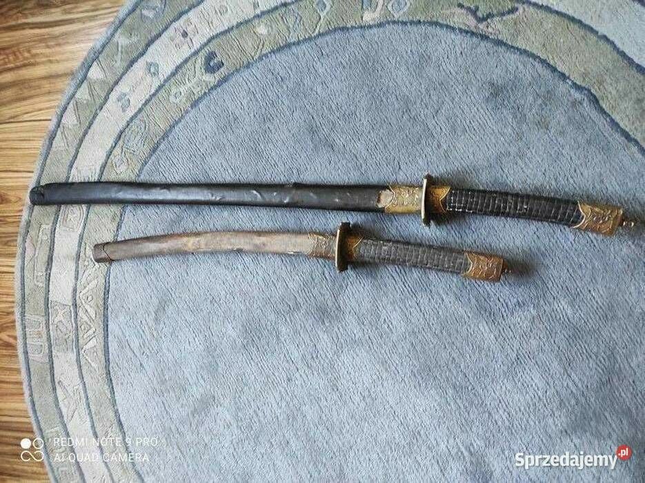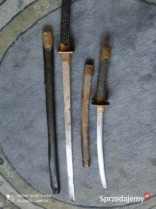 Stare 2 katany 1 długa,2 krótsza-Komplet po kolekcjonerze cena za obie,bo to jest komplet,pochwy drewniane obciągnięte skórą i mają sygnatury,co widać na zdjęciach.nie czyszczone nie rozkręcane. Jeżeli masz pytania propozycję pisz. Oświadczam, że oferowany przedmiot został pozbawiony cech użytkowych w rozumieniu ustawy z dnia 13 czerwca 2019 r. o wykonywaniu działalności gospodarczej w zakresie wytwarzania i obrotu materiałami wybuchowymi, bronią, amunicją oraz wyrobami i technologią o przeznaczeniu wojskowym lub policyjnym.AAAA